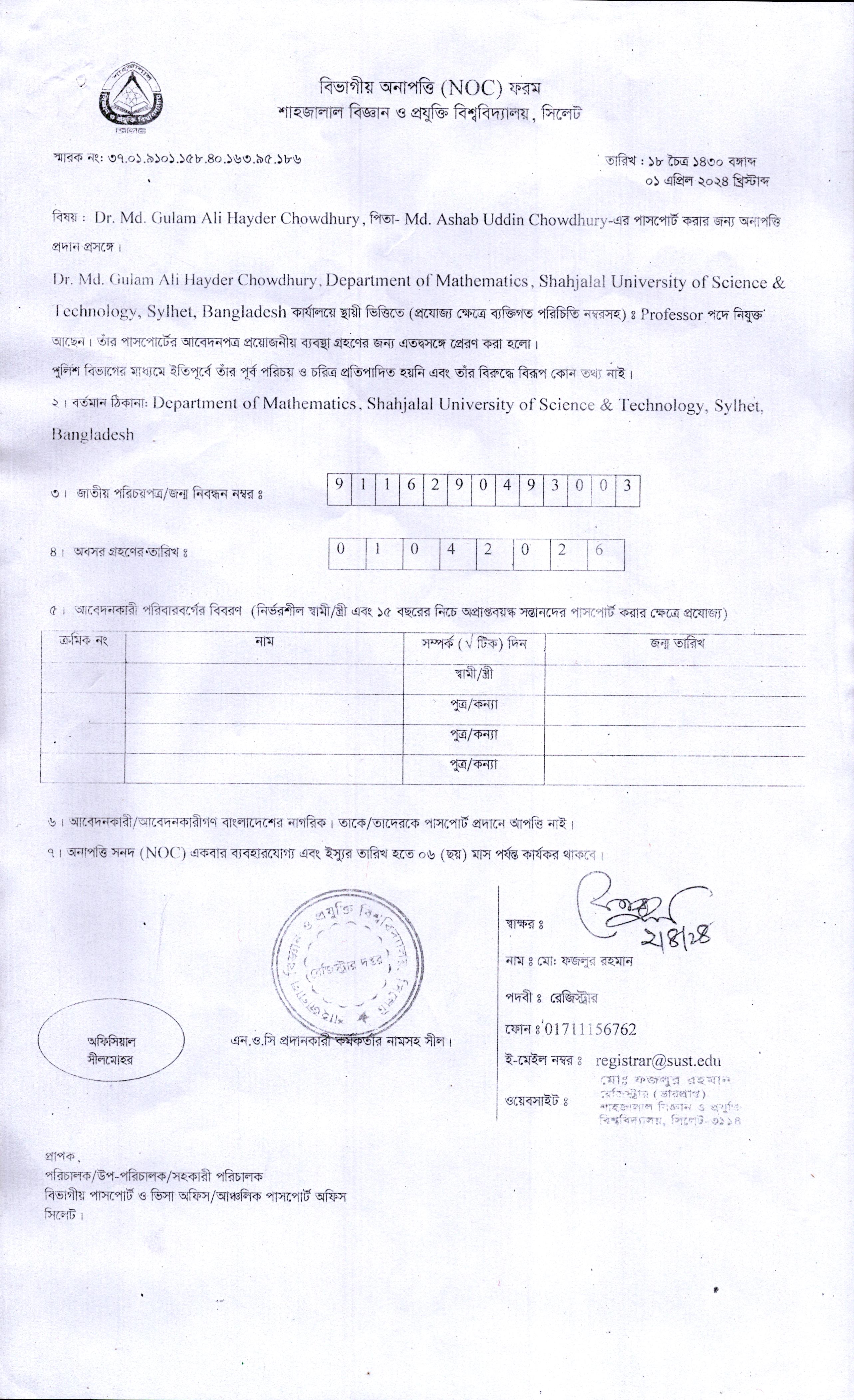 Dr Md Gulam Ali Hayder Chowdhury Professor Department of Mathematics Shahjalal University of Science and Technology, Sylhet, Bangladesh.
